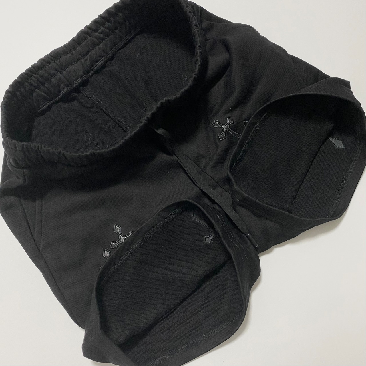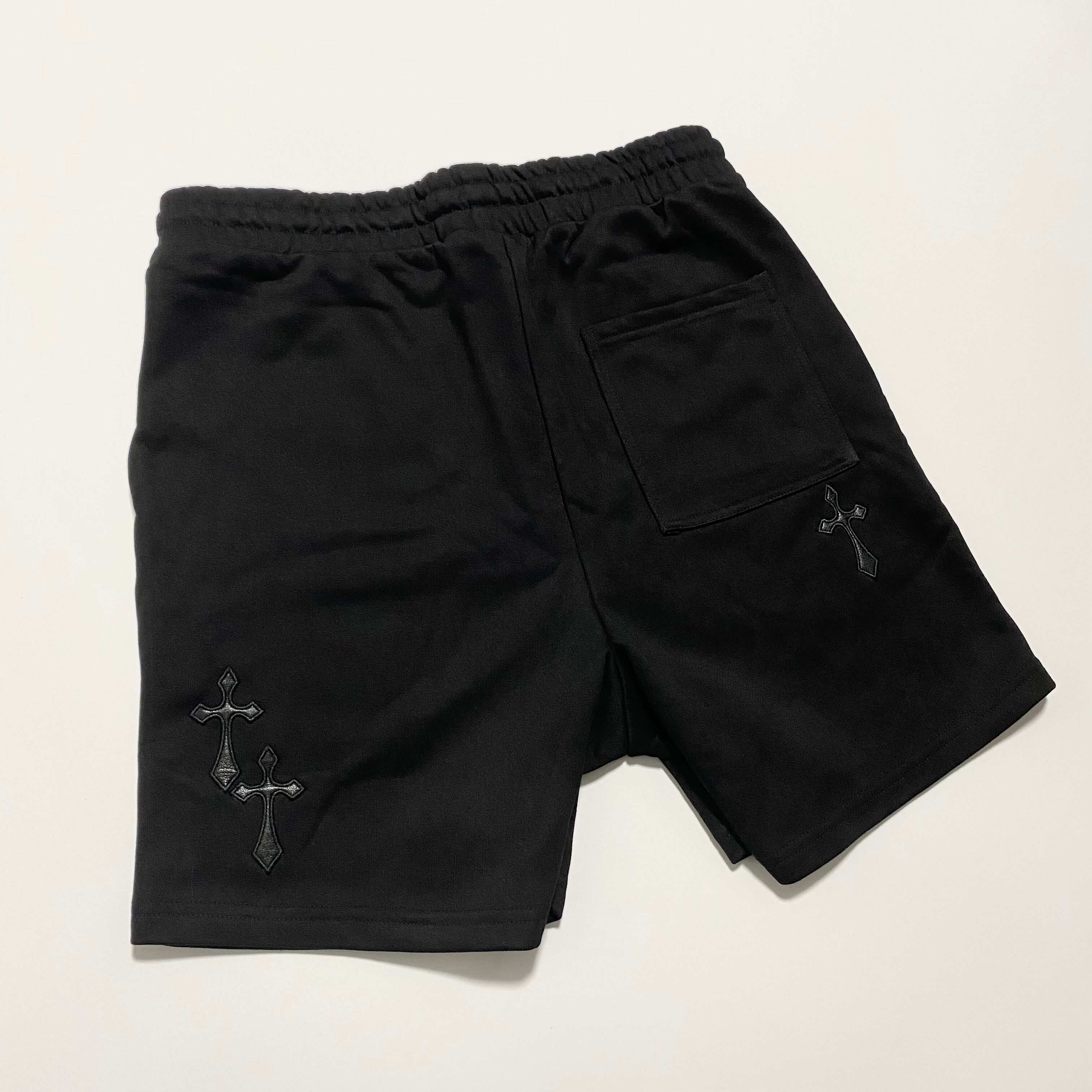 合皮で作られた十字架を前面背面どちらにも散りばめたカジュアルハーフパンツ